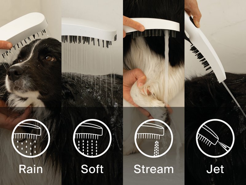 Die Handbrause ist so konzipiert, dass sie mit einer Hand bedient werden kann. Die vier verschiedenen Strahlarten lassen sich einfach per Drehhebel oder Taste an der Rückseite umschalten. Der isolierte Strahl mit Perlator ist gezielt und sparsam, ideal zum Waschen von Pfoten, Bauch oder der Unterseite des Körpers, ohne unnötiges Spritzen.