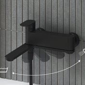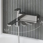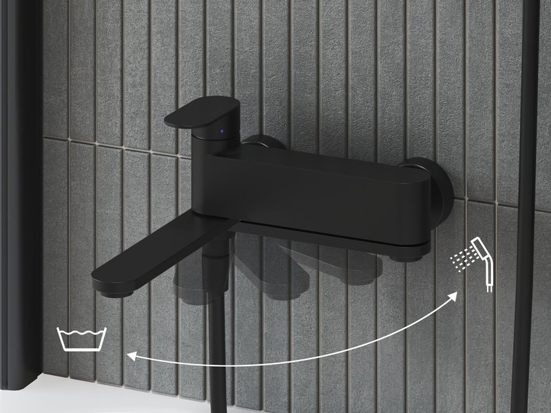 Die raffinierte Wannenarmatur verfügt über einen Auslaufarm, der zur Wand hin gedreht werden kann, sodass sie im Bad keinen unnötigen Platz wegnimmt. In dieser Stellung fließt die Dusche, wenn das Wasser aufgedreht wird. In der klassischen Stellung fließt das Wasser aus dem Wasserhahn in die Badewanne.